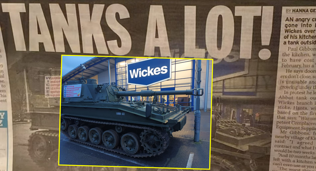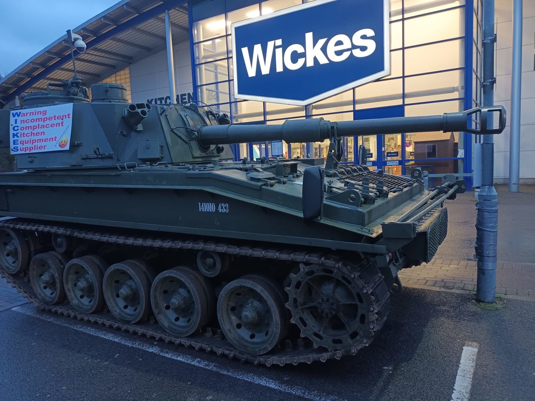 10개월간 골머리를 앓은 소비자는 군사 장비를 전문으로 제공하는 한 영국 회사에서 ‘탱크’를 구입했고, 포탑에 매우 창의적인 불만 표시를 붙인 다음 상점 정문으로 가져가 주차했다. 전등 기둥과 매우 가까이 주차된 해당 탱크를 견인하는 것은 불가능했다.